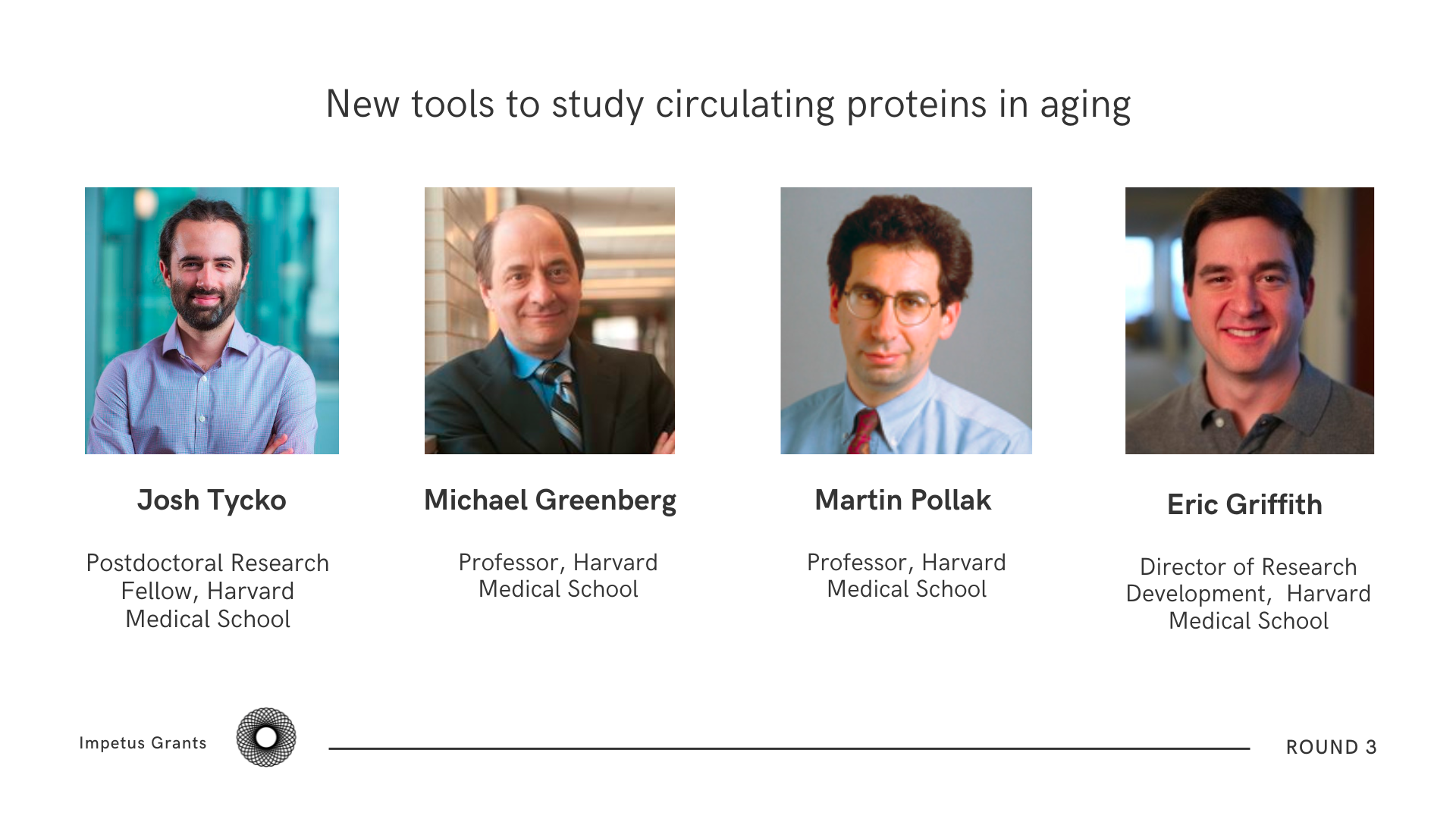 In June 2022 Impetus Grants concluded its second round and we are happy to finally share our results publicly. This round was unlike our previous open-ended effort as we aimed to fund labs that had ideas around addressing specific bottlenecks of the field - causality of methylation clocks, in vivo measurements of multiple aging mechanisms, interventional data in humans, and road mapping of open problems. In this round, we awarded 14 grants totaling $4 million to support groundbreaking scientific research across various disciplines and stages - from support to ideas with no preliminary data to ongoing clinical trials.