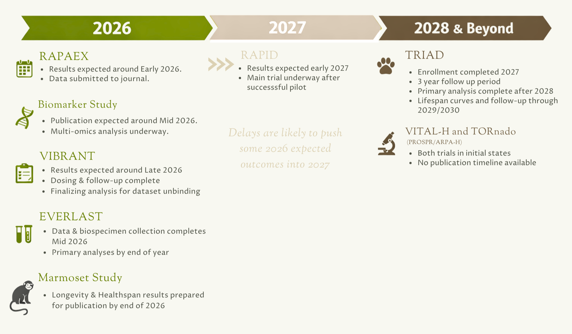 Finally, another bridge study is represented by TRIAD, the large, multicenter, randomized rapamycin trial in companion dogs led by Matt Kaeberlein. This isn't a human trial, but it is one of the most informative translation layers between mice and humans because pet dogs share environmental exposures, spontaneous disease patterns, and clinically meaningful outcomes in a compressed timeframe. The trial is explicitly designed to test whether rapamycin improves healthspan metrics and potentially lifespan in middle-aged dogs, using clinical-trial methodology (randomized, double-masked, placebo-controlled, multicenter). The study launched in 2020 but was interrupted by the pandemic and subsequently faced an 18-month funding gap before securing new support and restarting. The trial is statistically powered to enroll around 600 dogs and detect a 9% change in lifespan over a three-year follow-up period that follows a one-year treatment period during which dogs receive low-dose weekly rapamycin. Enrollment is expected to complete within the next year, after which all enrolled dogs will be followed for three years before a formal primary analysis is conducted. Importantly, this analysis will not yet include lifespan data — the team does not expect to publish survival curves before 2029. Around 200 dogs are currently in some stage of the study, either having completed treatment and follow-up, actively receiving treatment, or in the follow-up phase. The dataset remains blinded, and no interim signal has prompted early unmasking; no major side effects have been detected. One possible complication is that the team is not observing the rate of deaths they originally anticipated, likely due to a healthy cohort bias. Because enrollment selected for otherwise healthy dogs rather than a broadly representative population, the baseline mortality rate may be lower than the power calculation assumed, potentially requiring extended follow-up beyond the initial three years to accumulate sufficient events. TRIAD is among the most anticipated studies in the field: its sample size, duration, and clinical relevance mean that a positive result would carry more weight than almost anything else currently in progress.